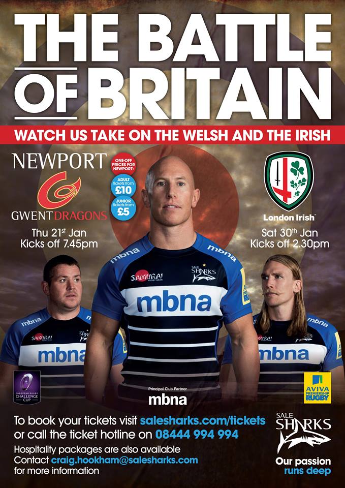 Sale Sharks have slashed ticket prices by 50% for their decisive fixture against Newport Gwent Dragons this Thursday (kick-off 7.45pm). Ticket prices for adults start from as little as £10, with juniors from just £5! Poster attached.