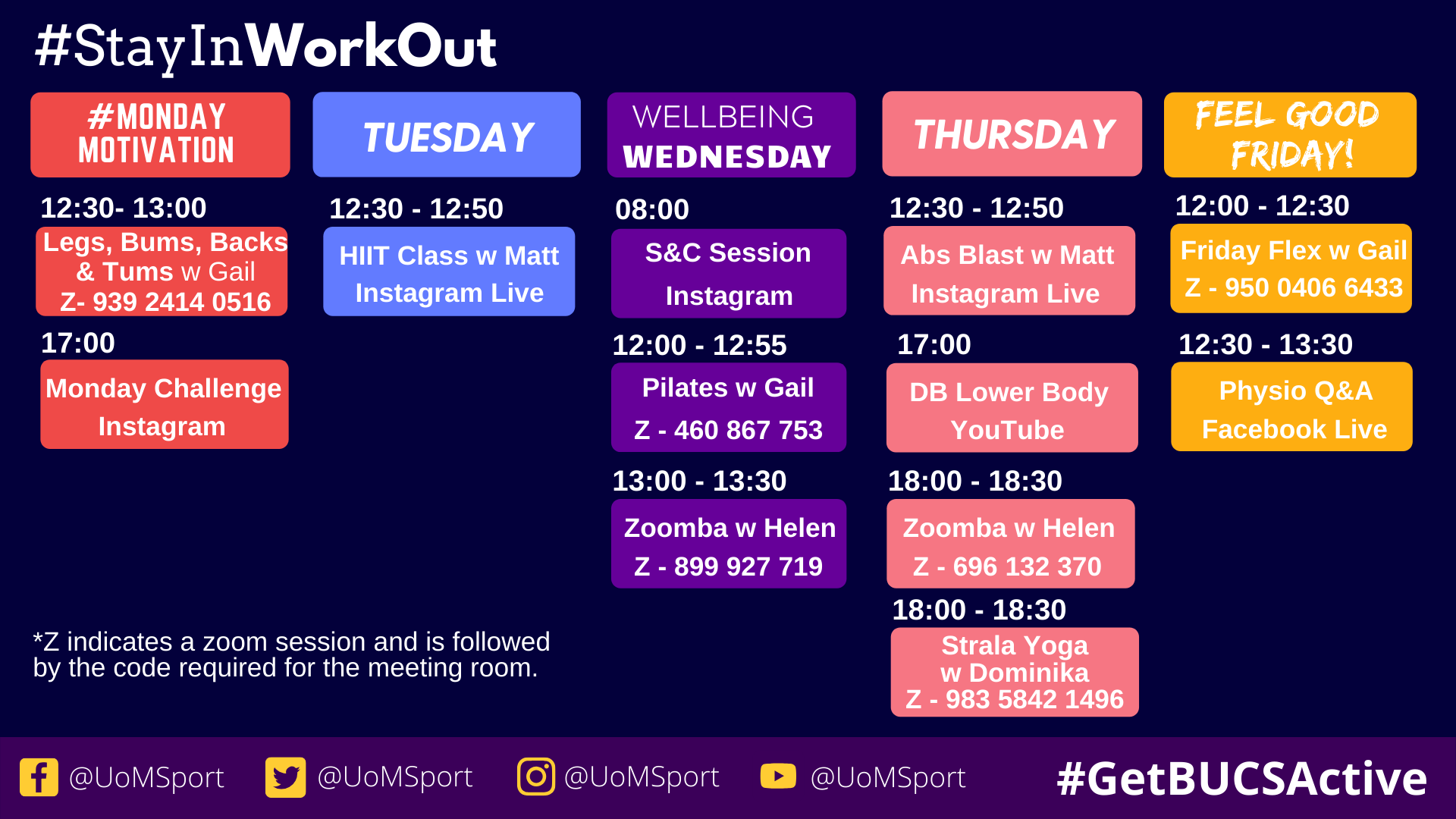 Each week UoM Sport offer online classes as part of the #StayInWorkOut campaign.