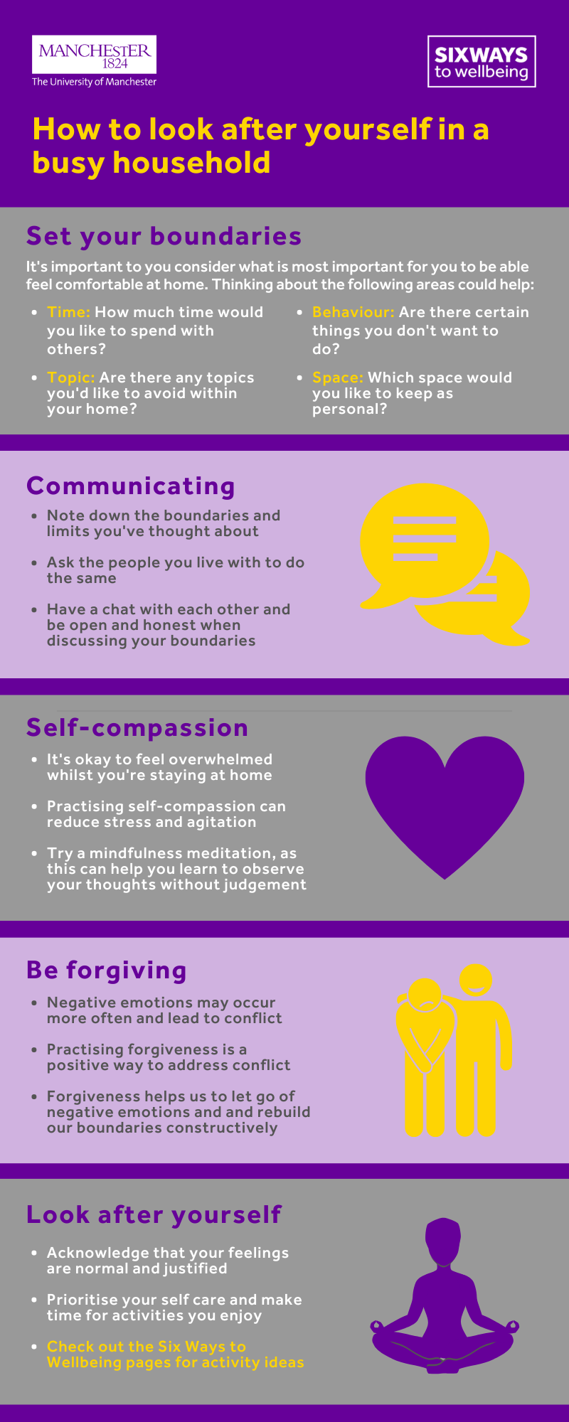If you are still working from home you may have feelings of being overwhelmed due to being in a busy household environment. If this is the case, this infographic can help.
