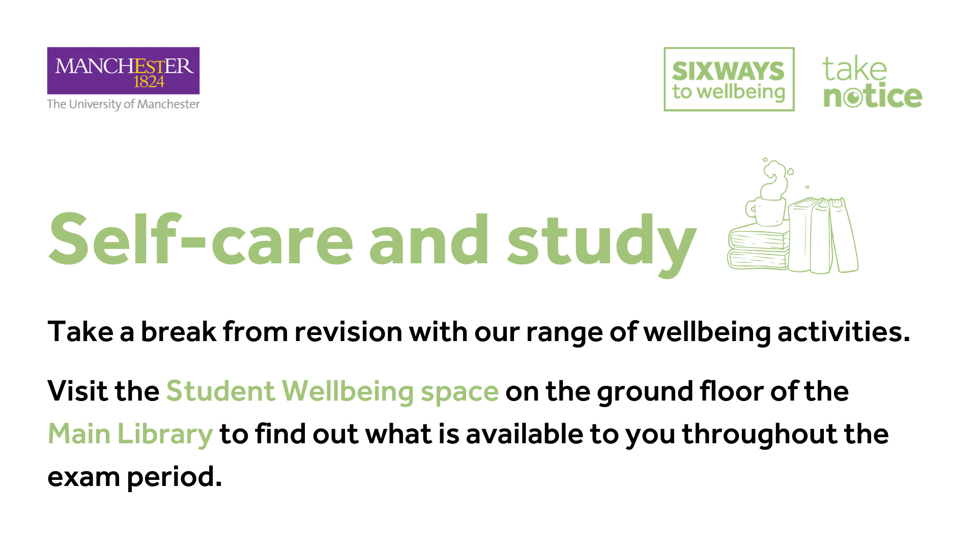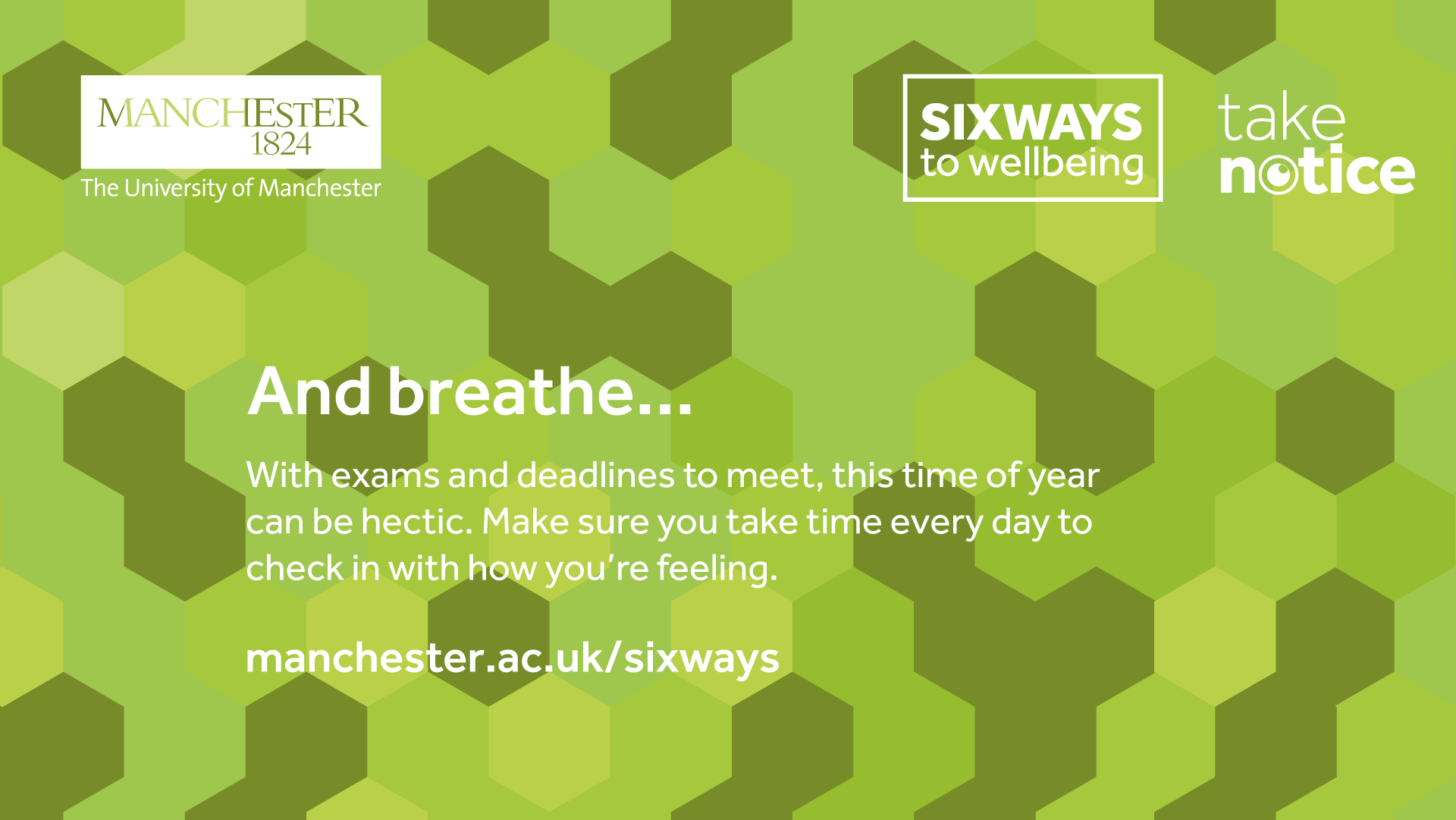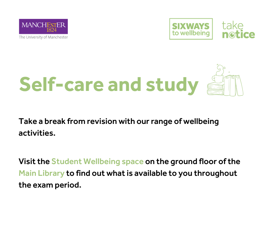 For more information, visit: www.studentsupport.manchester.ac.uk/taking-care/wellbeing/takenotice/.