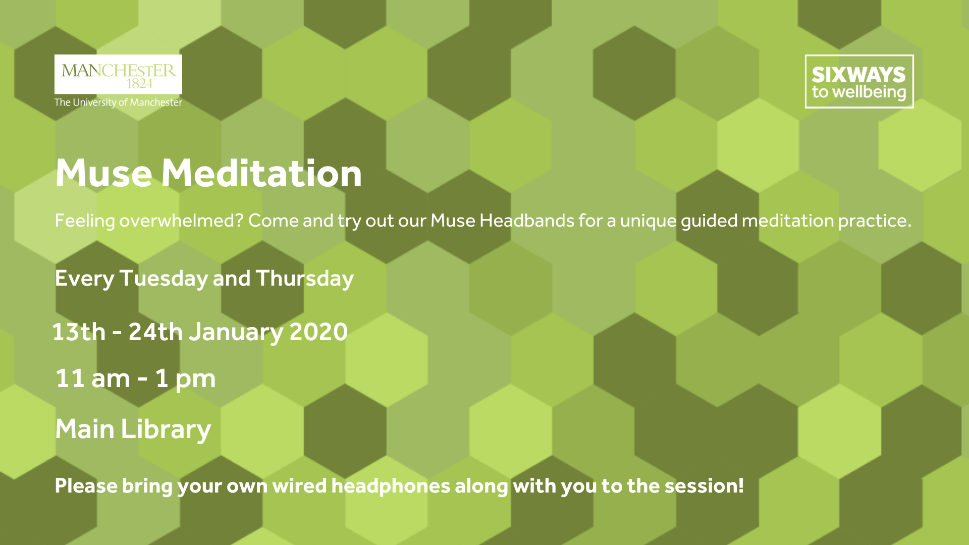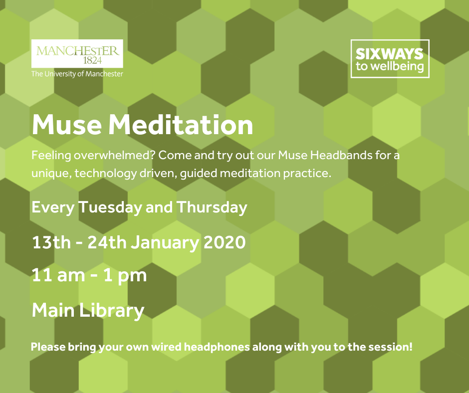 Feeling overwhelmed? Join us for a meditation session using our brainwave-sensing headband. During the January exam period, muse meditation sessions will take place on a drop-in basis and will be held in the pod in the large space at the back of the University's Main Library on the ground floor.
