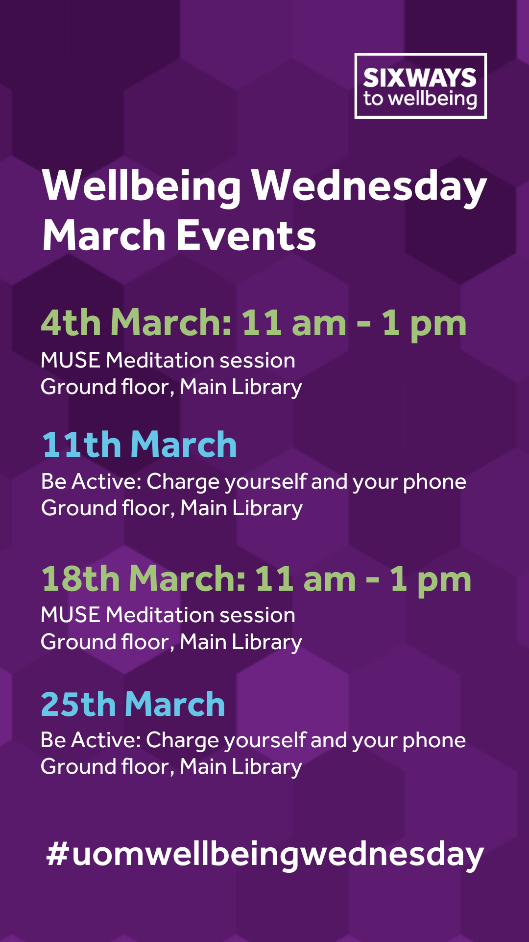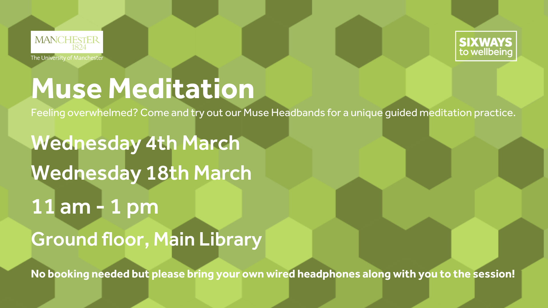 - Wednesday 4th March: Muse meditation session (11am - 1pm, Main Library, ground floor)