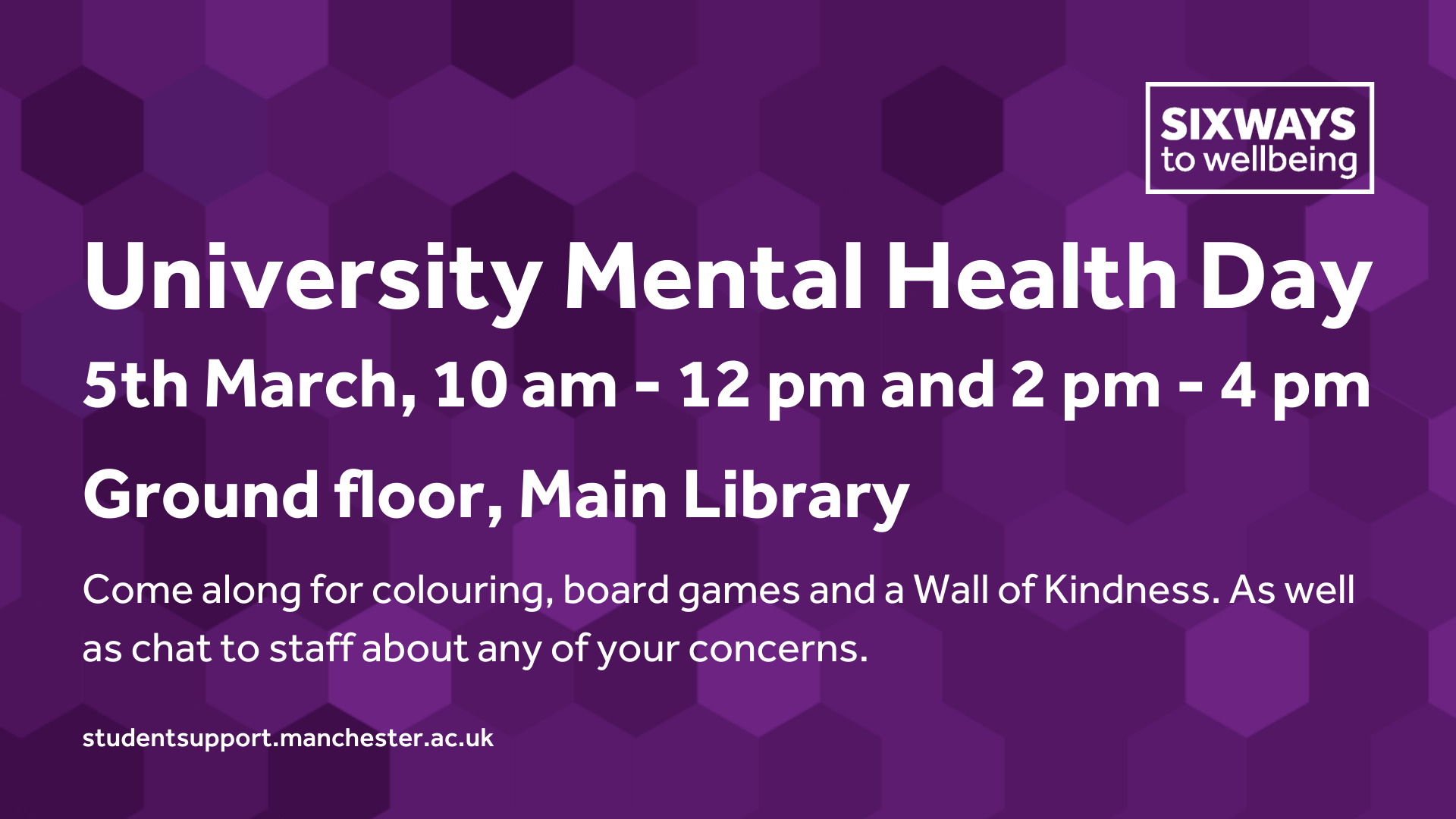 We know that students experience their own unique struggles when it comes to mental health. To highlight this important issue, 5th March is National University Mental Health Day. To mark this day, we're running an event in the ground floor event space of the Main Library between 10 am - 12 pm and 2 pm - 4 pm. Come along to chill out with mindful colouring and board games or contribute to our Wall of Kindness to help make campus a kinder place. We'll also have staff from the Student Support and Wellbeing team around to chat about any concerns you may have.