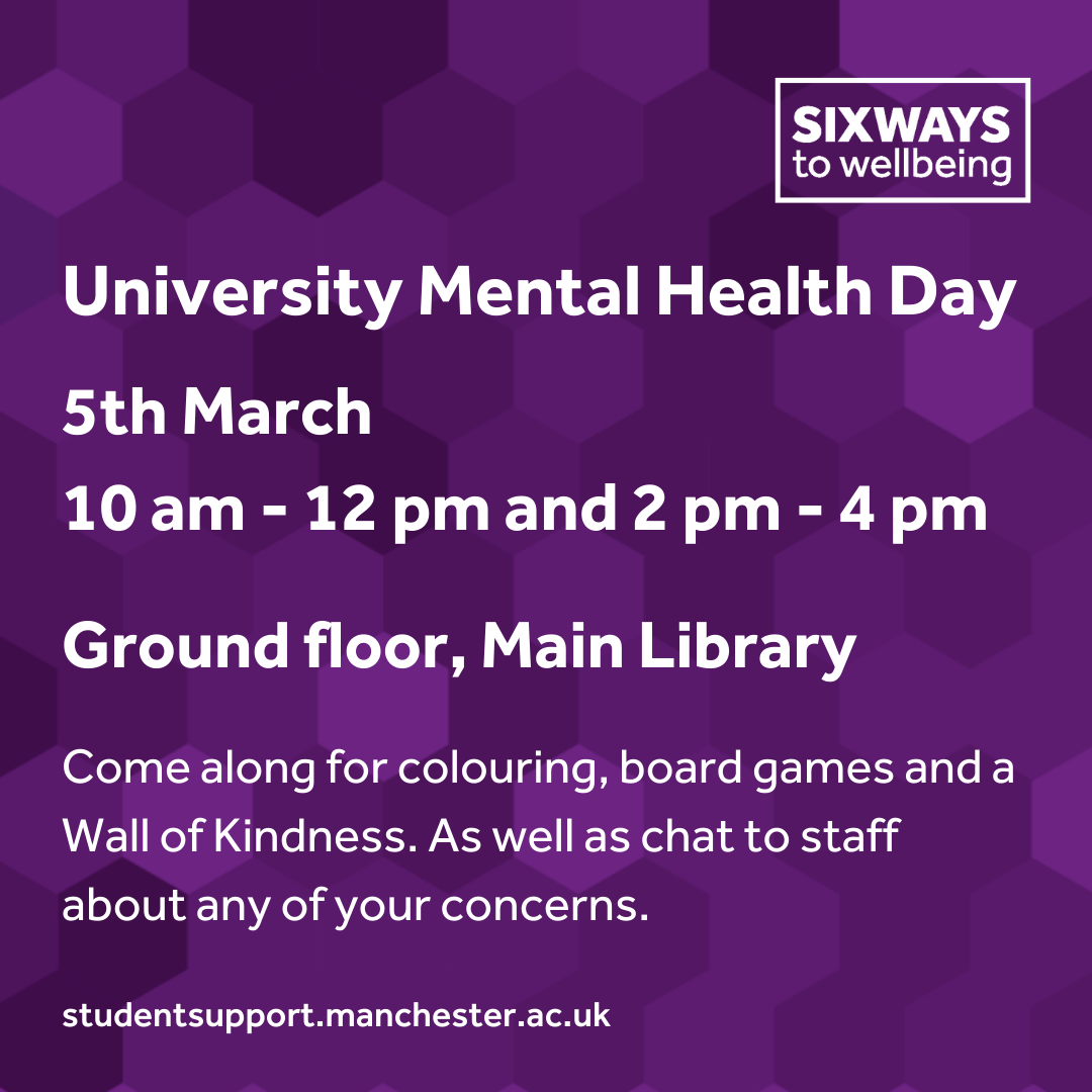If you'd like to run your own events (large or small!) to promote positive wellbeing and need some inspiration for activities, take a look at this event ideas page or if you have any questions or activity ideas that you’d like to speak to us about, please email: studentsupport@manchester.ac.uk